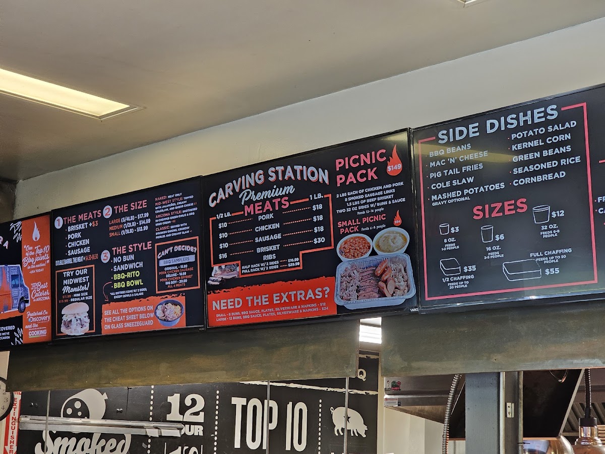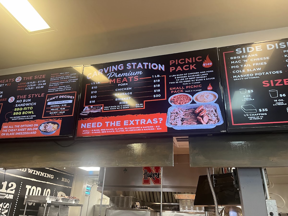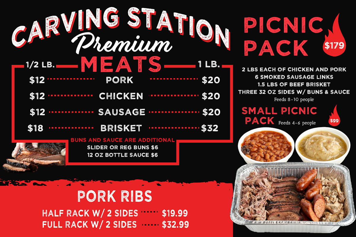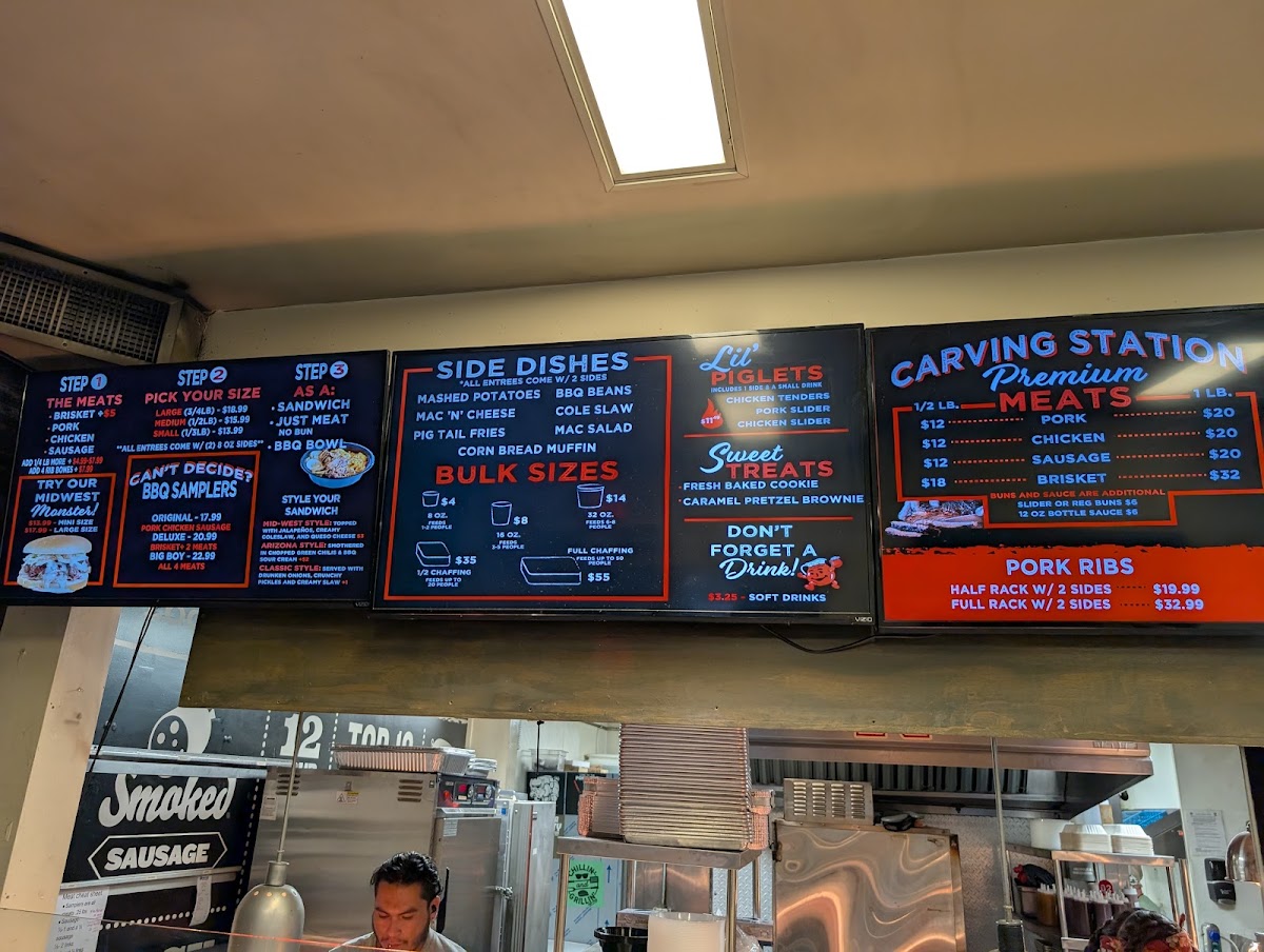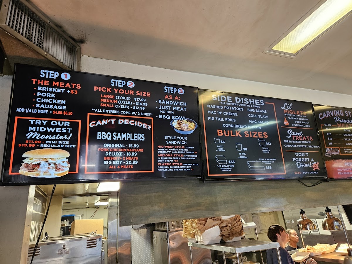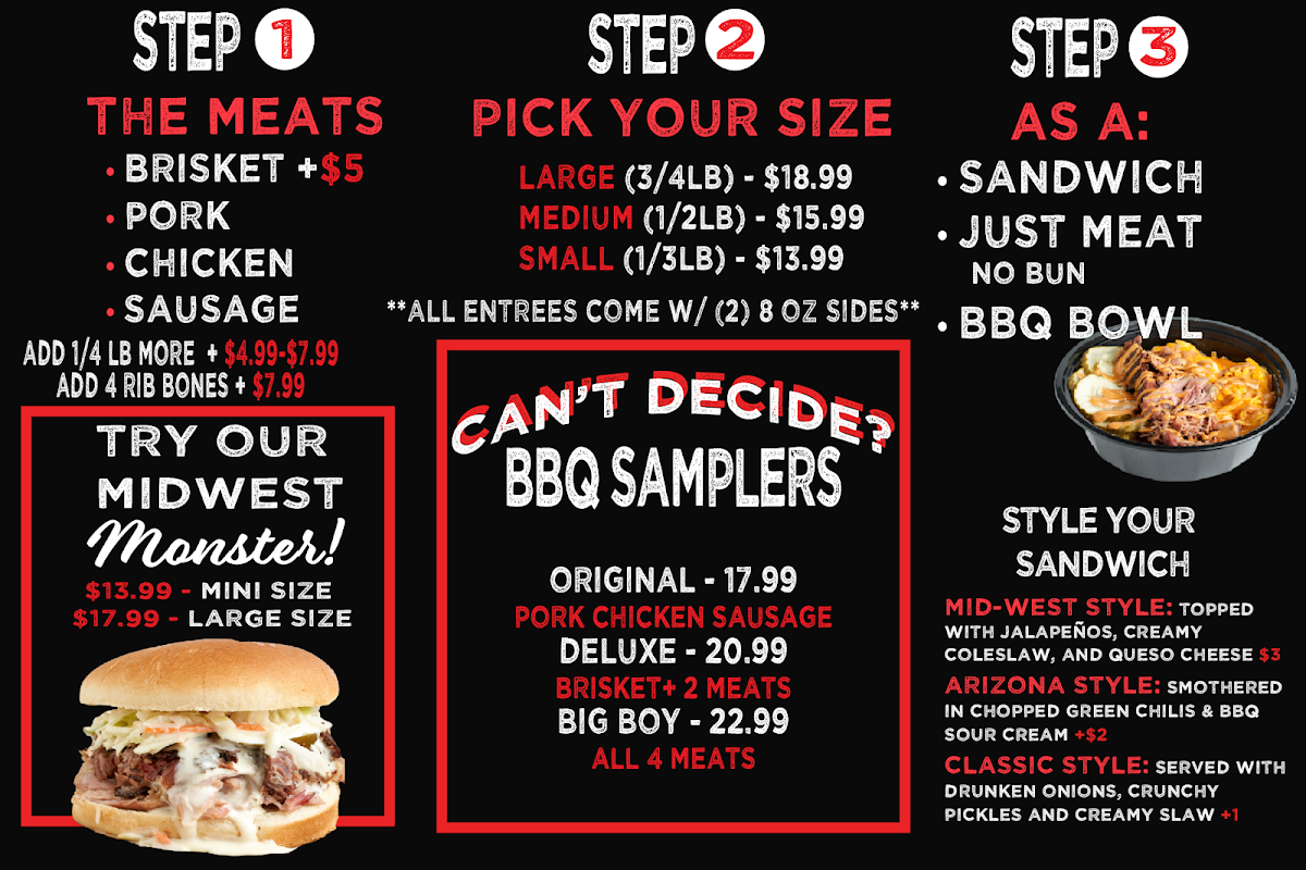 - BBQ Samplers: Try the original pork, chicken, and sausage starting at $17.99, or indulge in the deluxe brisket with two meats for $20.99.