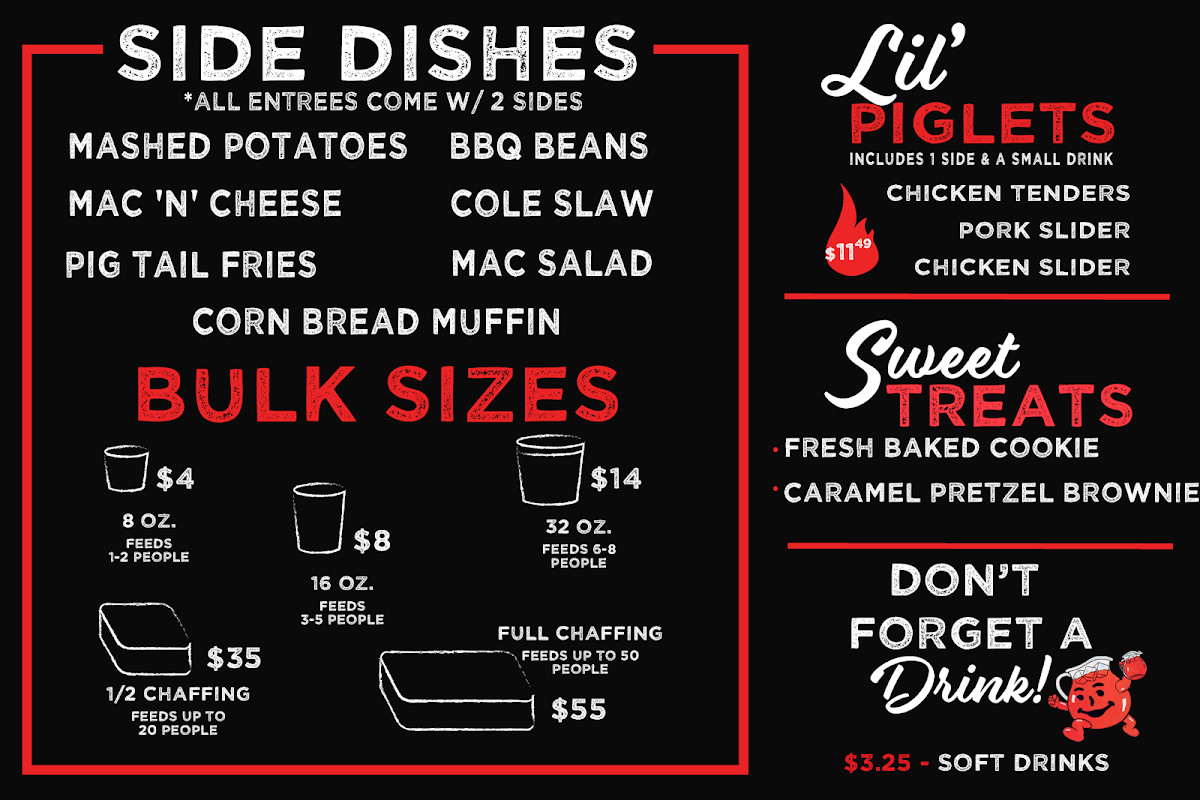 - Lil' Piglets: Perfect for lighter appetites, featuring chicken tenders and sliders.
